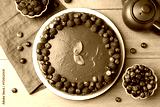 Delicious chocolate cheesecake with berries, mint and teapot on wooden table, flat lay