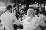 Business people discussing and analyzing progress charts in an open-air venue, exhibiting teamwork, collaboration, brainstorming, and a focus on professional goals and communication strategies.