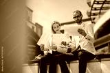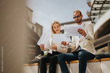 A man and woman reviewing papers while working outdoors, representing teamwork and business collaboration in an urban setting.
