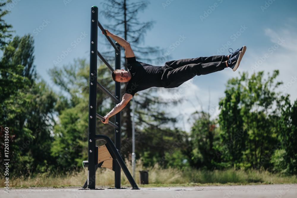 Athletic man demonstrating impressive strength and balance in a human flag position on fitness equipment outdoors, surrounded by a natural green park setting on a sunny day.