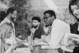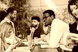 A group of professionals discussing ideas and working collaboratively at an outdoor meeting table. Focused individuals interacting in a relaxed and productive atmosphere amid natural surroundings.