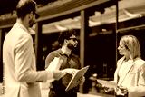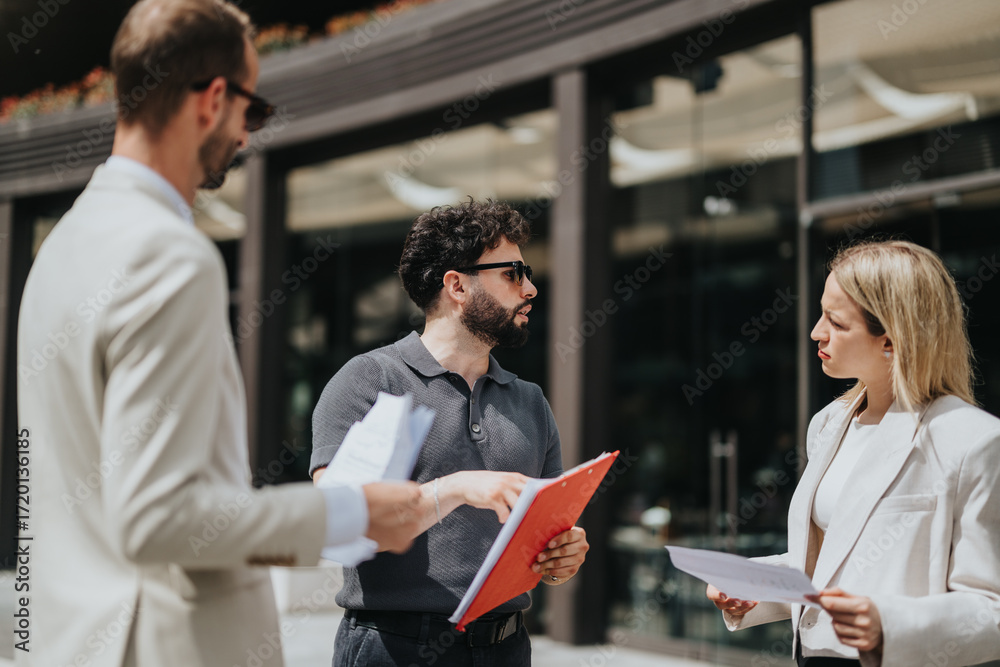Focused urban professionals gathered for a business discussion with paperwork outdoors, near modern architecture. Collaboration and organization emphasized in a professional and contemporary ambiance.