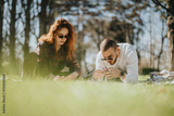 Two young individuals enjoy a calm day outdoors while relaxing on a grassy park.