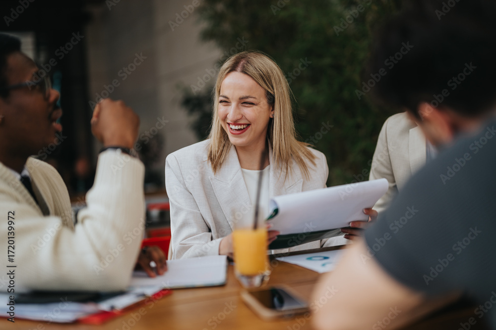 Three coworkers gathered at an outdoor setting, emphasizing teamwork, laughter, and productive dialogue.