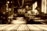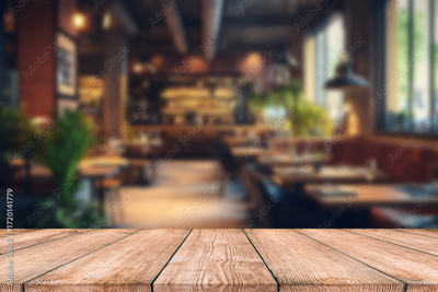Empty dark wooden table in front of restaurant abstract blurred bokeh background. can be used to demonstrate or mount your products. Layout for space