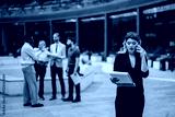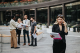 A group of business professionals in a discussion while another is engaged on the phone, situated outdoors near a contemporary office complex.