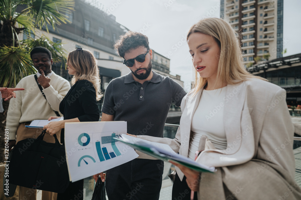 A diverse team of business individuals working together, examining a printed data chart outdoors.