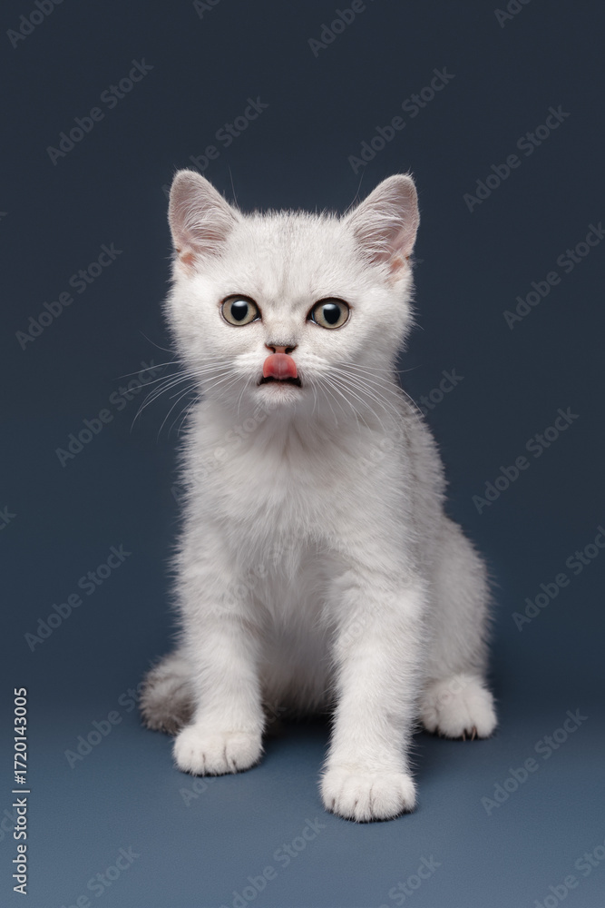 Portrait. A cute and fluffy white British Shorthair kitten sits in the studio with its tongue out, looking at the camera.. Vertical photo