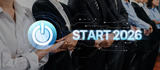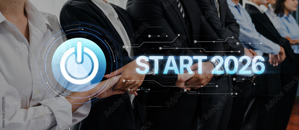 Diverse group of business professionals standing together, symbolizing teamwork and innovation while looking ahead to new opportunities and goals for 2026. Trope