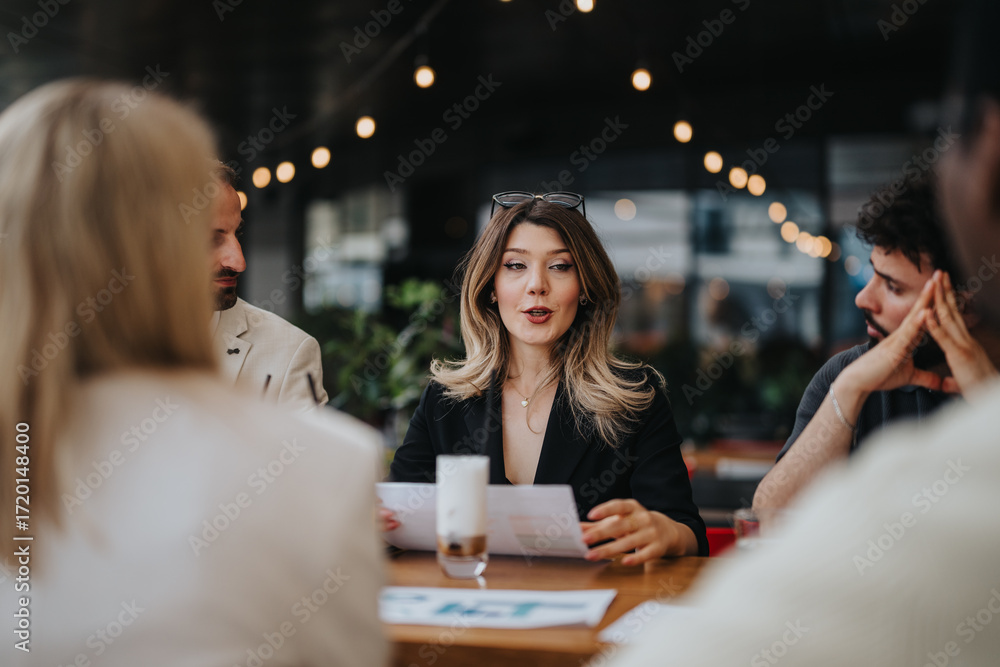A group of professional individuals engage in a dynamic meeting at a modern outdoor space.