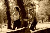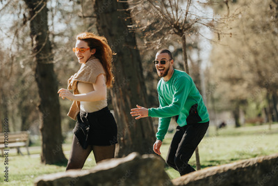 A happy couple enjoying a lively interaction in a sunny outdoor park setting. They are playfully running and laughing, expressing joy and connection amidst a background of trees and open nature.