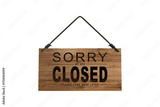 Wooden board signs with open closed business status displayed on hanging displays. Dark brown and beige stylish wood textured plaques mounted with rope. Shop entrance labels for retail store front.