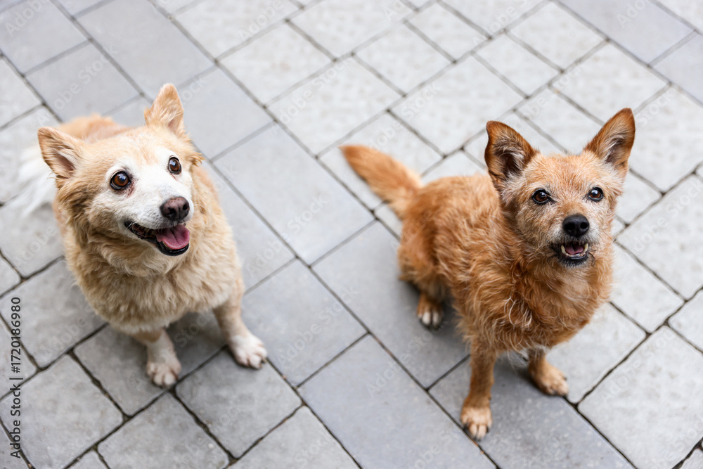Cute stray dogs on pavement outdoors, above view. Homeless animal