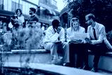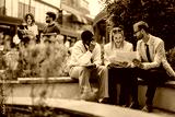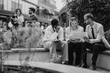 Three colleagues collaborate on a project outdoors, while two others discuss nearby. The scene portrays teamwork and professional interaction in a modern city setting.