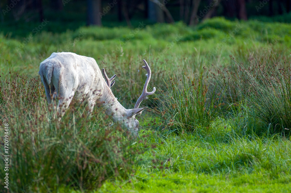 Biały jeleń z dużymi rogami samotnie skubie trawę na łące ujęcie z bliska.