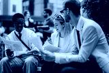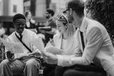 Group of professionals reviewing papers together in an open-air city environment, sharing insights and planning effectively. The photo exudes collaboration, teamwork, and creativity.