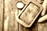 Freshly baked cornbread in baking dish, cobs and flour on color wooden table, flat lay. Space for text