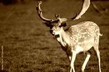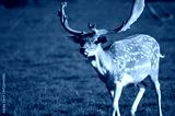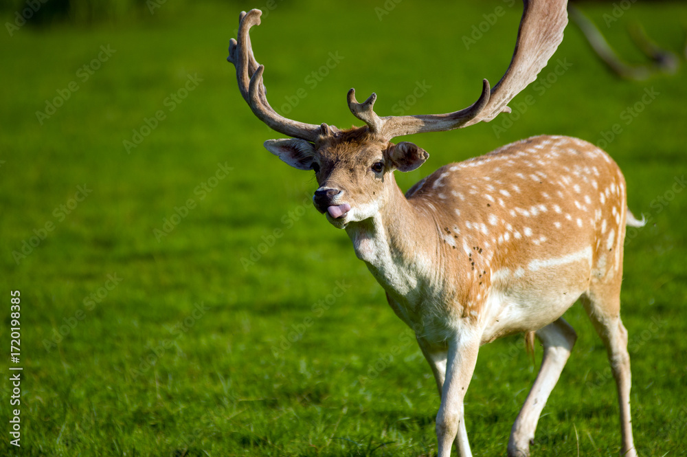 Jeleń daniel zwyczajny na łące ujęcie z przodu.