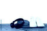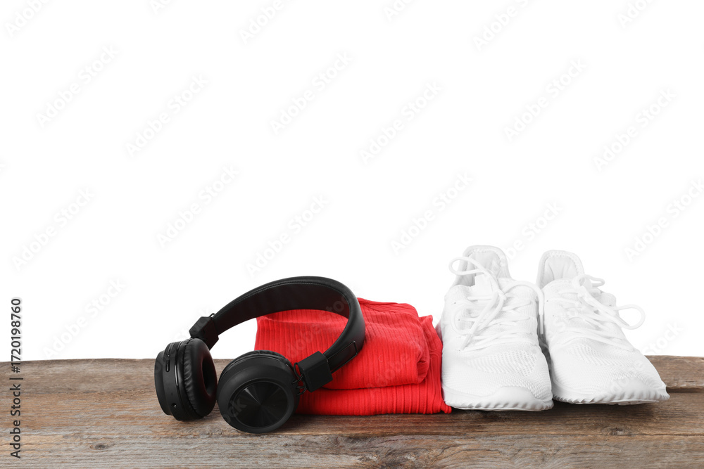 Stylish sneakers, headphones and sportswear on wooden table against white background