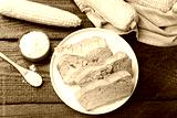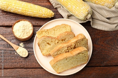 Freshly baked cornbread, cobs and flour on wooden table, flat lay