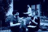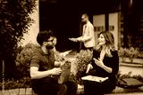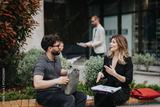 A man and a woman discussing business documents while sitting outdoors near greenery.