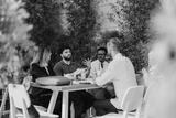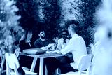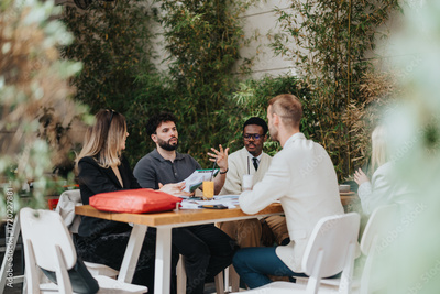 A group of diverse business professionals conversing during an outdoor team meeting.