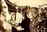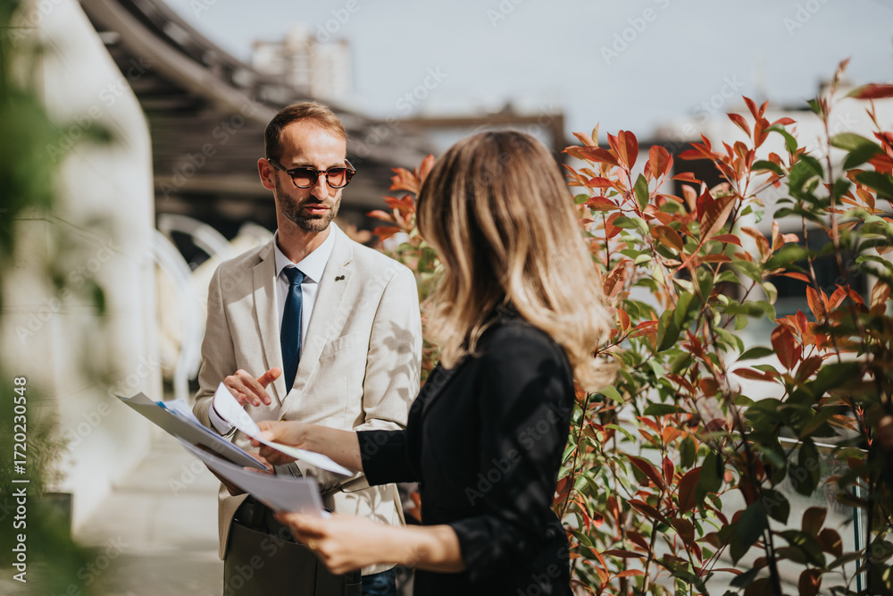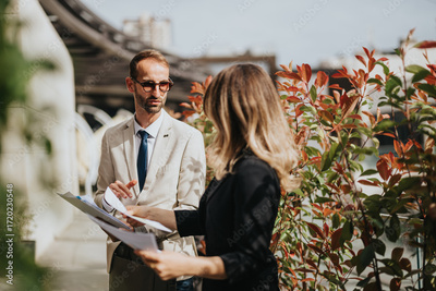 Two business people engage in a discussion while reviewing documents outdoors on a sunny day. The setting offers a modern urban backdrop with foliage, emphasizing professionalism and collaboration.
