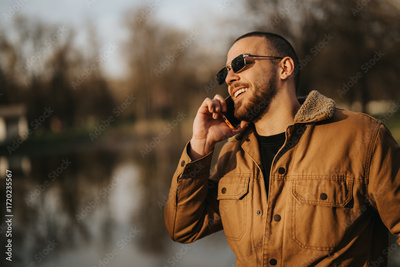 Man stands near a park lake, smiling while engaging in a phone call conversation.
