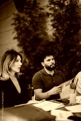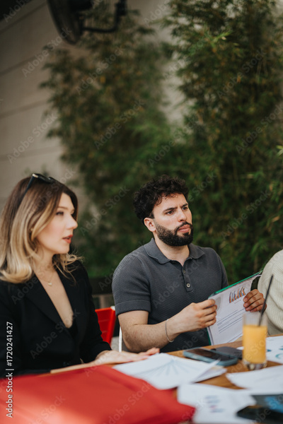 Engaged business professionals discussing ideas and presenting data during an outdoor meeting with natural surroundings.