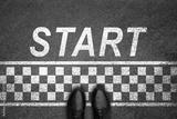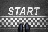 A pair of feet on a tarmac road with white print of the word start for the concept of starting point and the finish line.