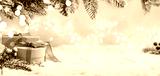 Two kraft paper gift boxes with brown ribbon sit on snow surrounded by frosted pine branches and soft glowing lights. Winter Christmas Holiday Decoration Background