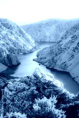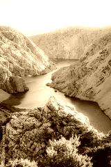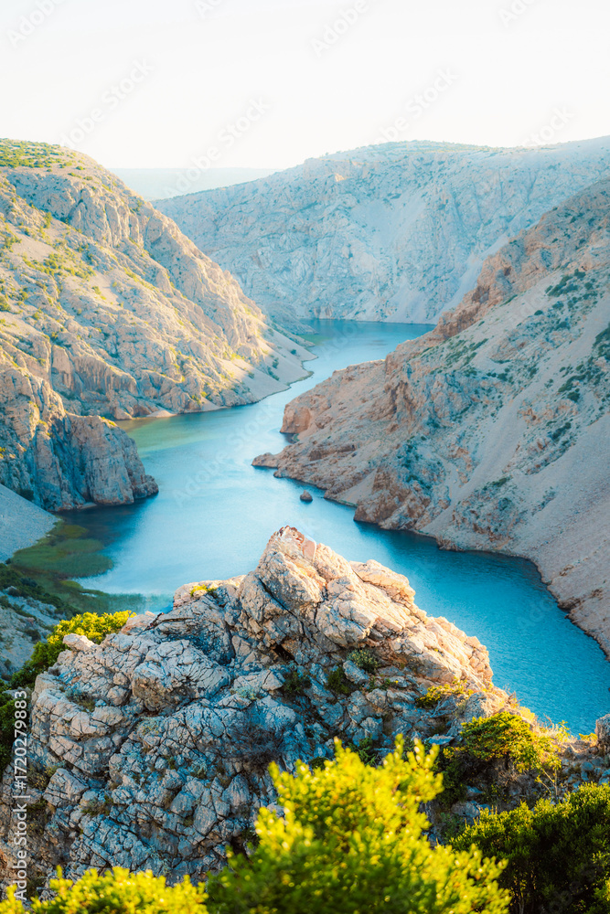 View of the Zrmanja River Canyon in Croatia, with winding turquoise waters cutting through limestone cliffs. A scenic natural wonder popular for kayaking and hiking