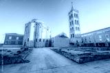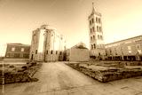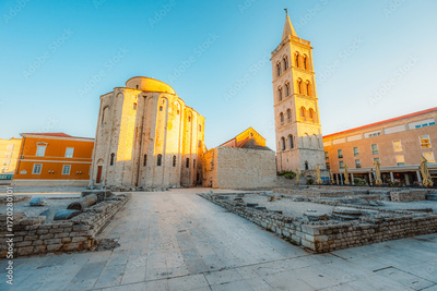 Zadar, Croatia. Old town street of Zadar with the Church of St. Donatus and the bell tower of the Cathedral of St. Anastasia at sunset.