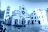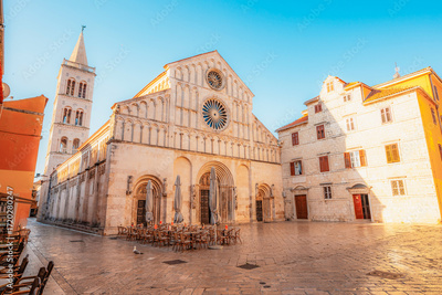 Zadar, Croatia. Old town street of Zadar with the Church of St. Donatus and the bell tower of the Cathedral of St. Anastasia at sunset.