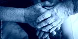 Close-up of elderly hands clasped together, symbolizing support and care. The image highlights aged hands, emphasizing connection and compassion. Elderly couple at care home.