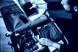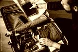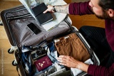 Man packing suitcase with clothes, map, and camera. Travel essentials include a map, camera, and clothes. Preparing for a trip with a suitcase and travel items. Man getting ready to travel.