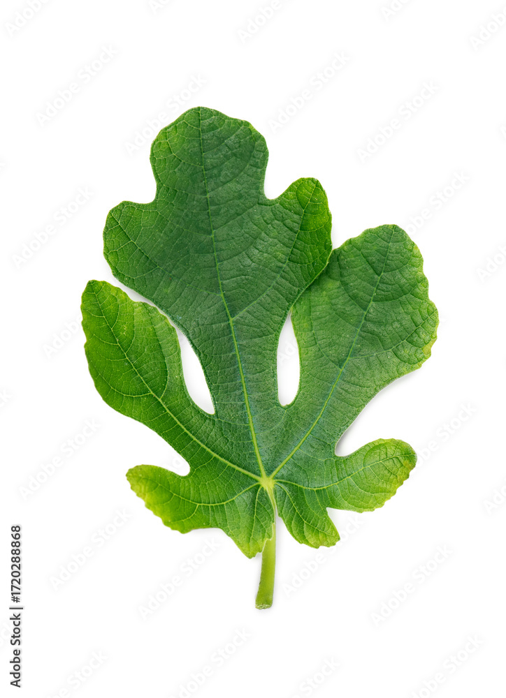 Fig leaf isolated on white background, cutout. Fig fruit one leaf, top view, flat lay