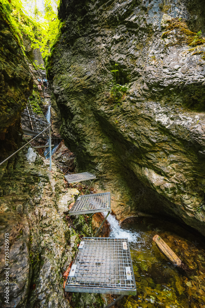 Waterfall with ladder in canyon, sucha bela in Slovak Paradise or Slovensky Raj National Park in Slovakia.