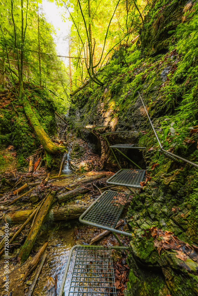 Waterfall with ladder in canyon, sucha bela in Slovak Paradise or Slovensky Raj National Park in Slovakia.