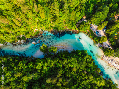 Wonderful Soca river and gorge in the green forest, Bovec, Slovenia. Kayaking destination in Slovenia in Triglav National park