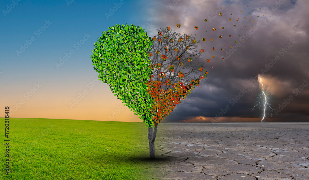 Tree in an imaginary landscape in climate change from drought to green growth