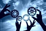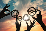 Hands of businessmen assemble a puzzle from gears against the sky in the sunset. business concept idea, partnership, innovation, teamwork, cooperation