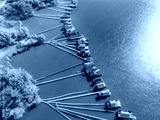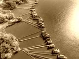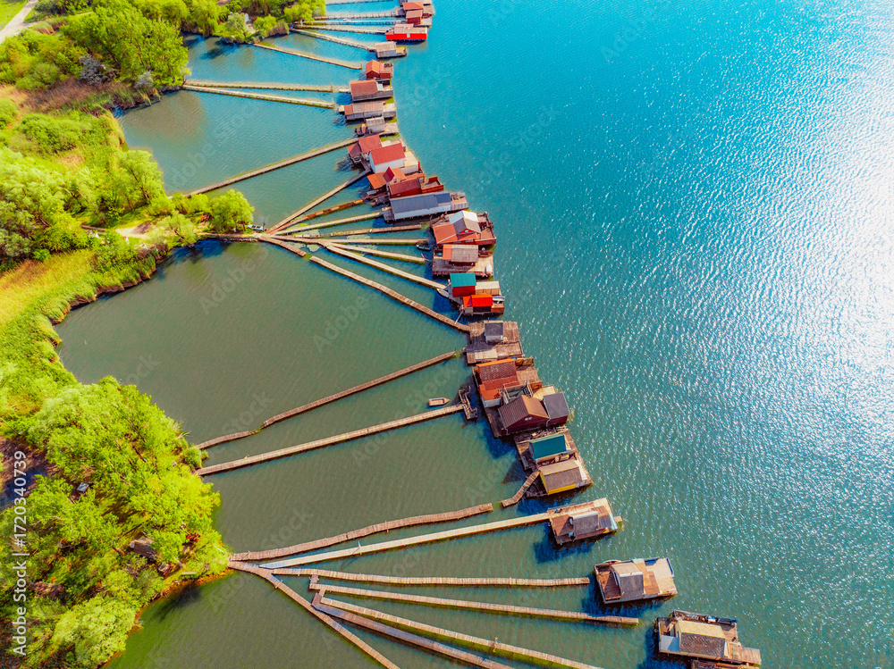Floating village Bokodi in Hungary. Houses belong to local fishermen. aerial