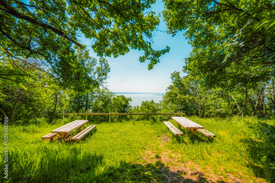 Hiking view from hill Badacsony, the highest mountain in the Tapolca basin near Lake Balaton near Badacsonytomaj.