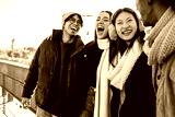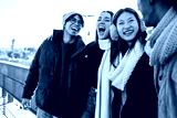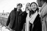 Multiracial tourist friends in winter clothes enjoying vacation in Barcelona. Millennial gen z people having fun at city street. Youth community and friendship concept