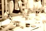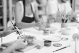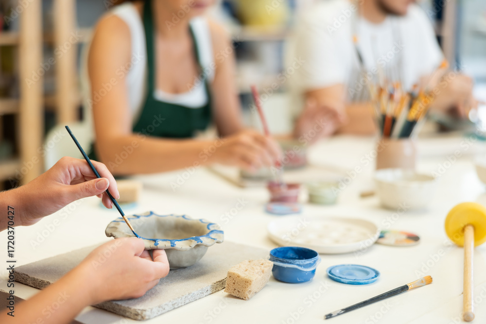 Close up of female hands painting ceramic plate with paint and brush in pottery workshop