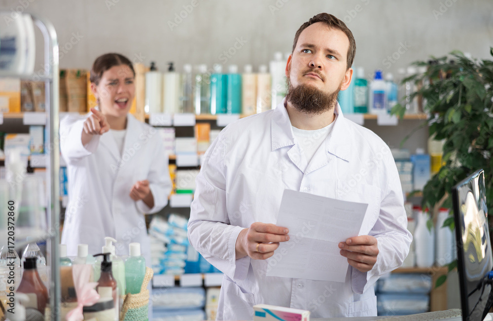 Confused male pharmacist employee during argument with boss. Subordinate with documents in hands, boss yells at employee and threatens to fire him