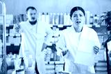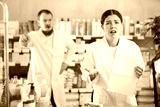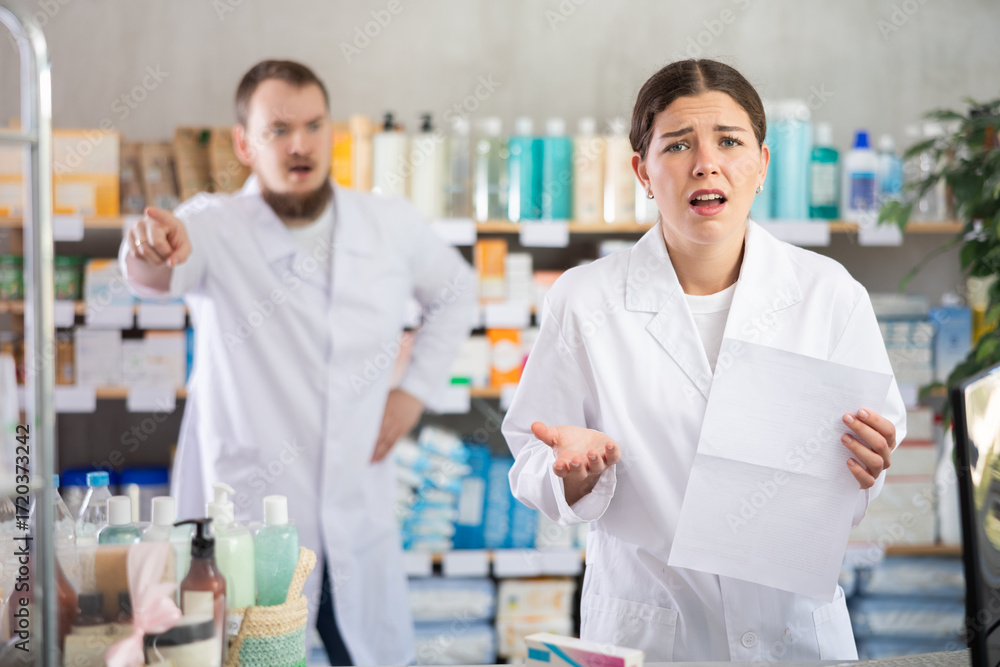 Upset female pharmacist with resignation papers in front of an angry male pharmacist. Pharmacy manager emotionally fires a female pharmacist