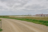 A gravel country road curves through the prairie landscape toward an industrial potash mine in Saskatchewan, Canada, with processing buildings, tailings pile, and cloudy sky in the distance.
