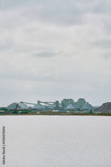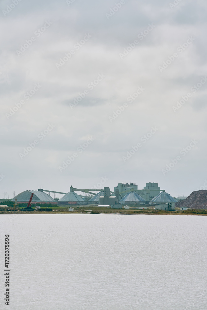 Industrial potash facility with dome storage buildings and conveyor systems viewed across a body of water in Saskatchewan, Canada, under a dramatic cloudy sky.